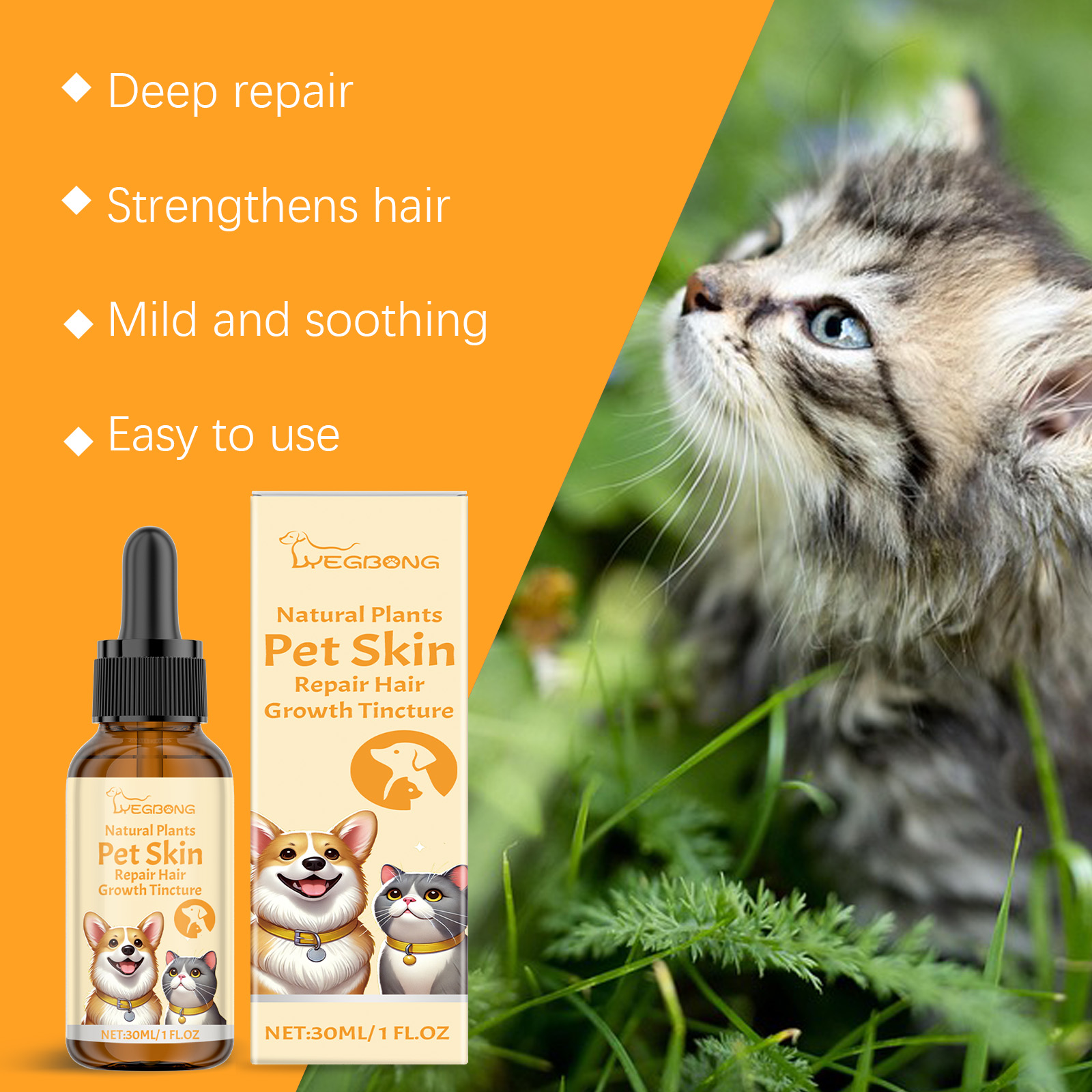 Our pet skin repair drops contain tea tree oil, lecithin. It can help repair pet skin and maintain a healthy state. Its method of use is simple: apply 2-3 drops to the skin of the pet's affected area and gently massage it with your hands to help absorb. And it can help pet skin repair and hair regeneration to restore pet fur to a healthy state.